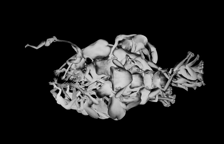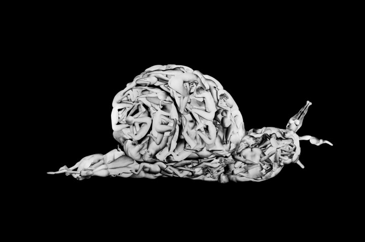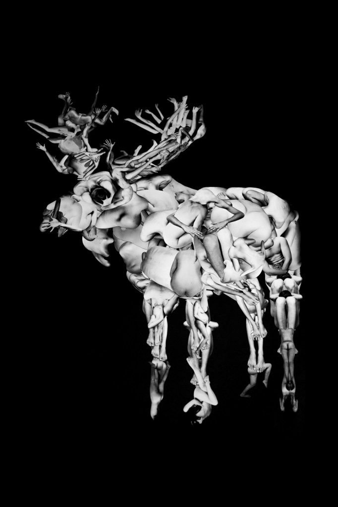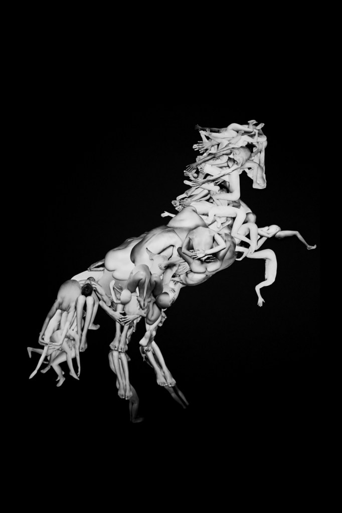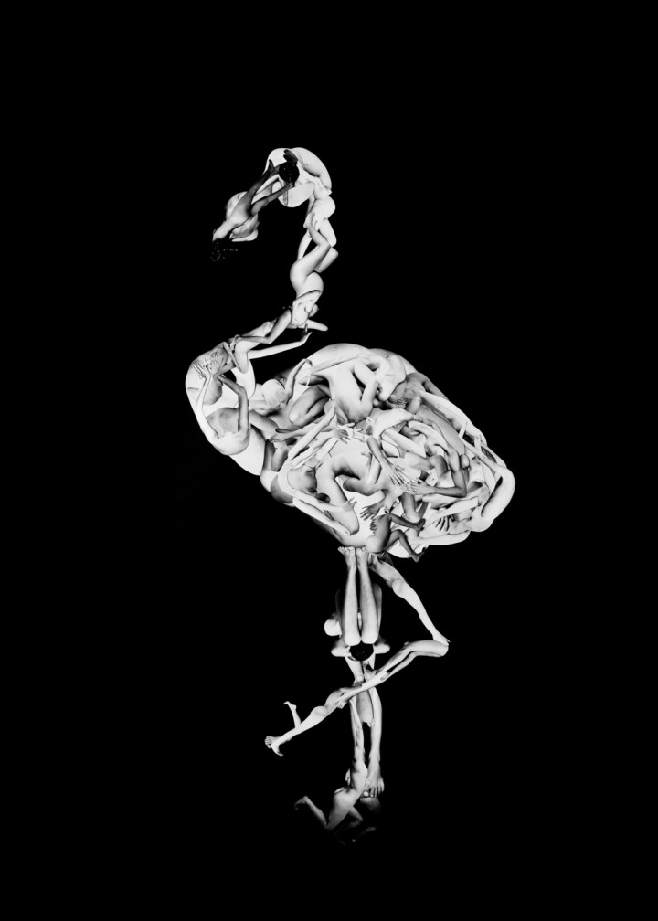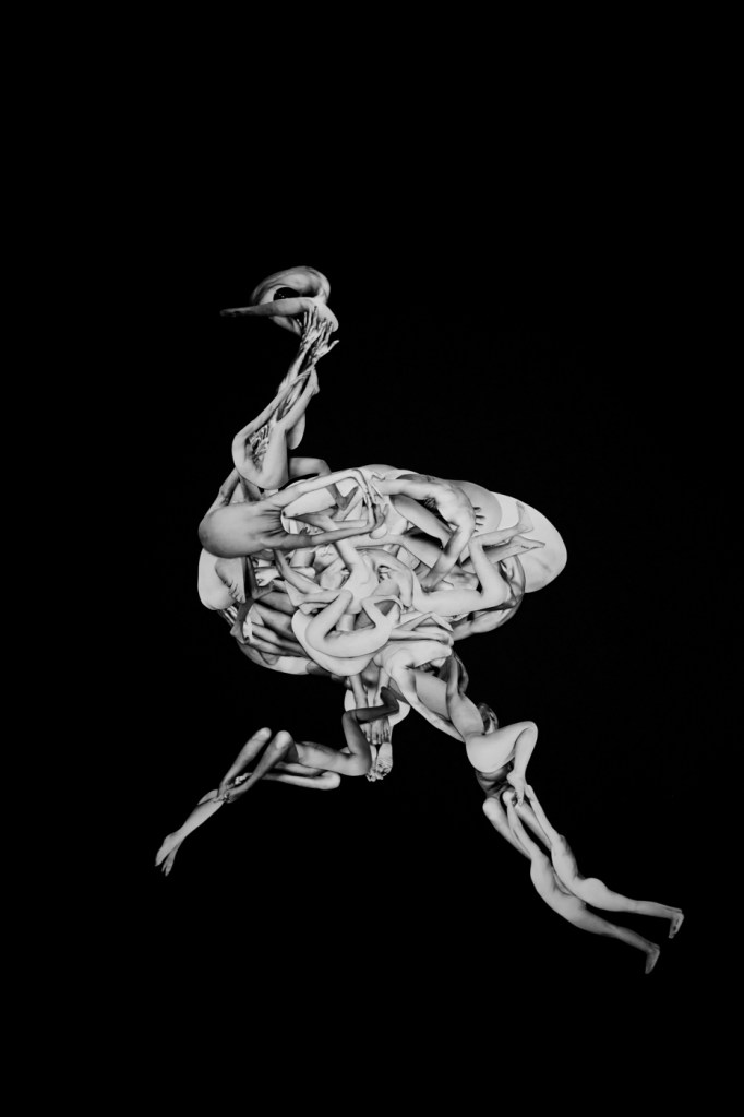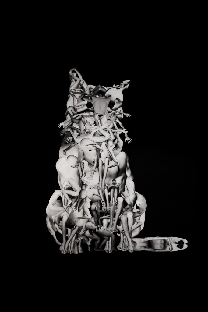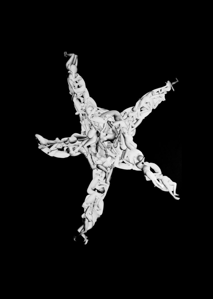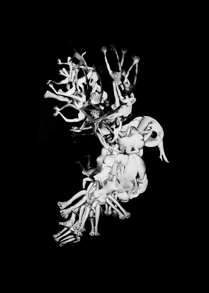 I employ the technique of collage, executed entirely by hand. I meticulously cut over 700 images using scissors, later reassembling them equally by hand. The basic elements are constituted by nude photographs taken over the years, each one unique and irreplaceable. The crafting and reassembly of these images brought to my mind the processes of cellular biology: each element, simultaneously similar and distinct, contributes to the creation of a remarkable diversity of life forms. The decision to use a wholly manual technique, embracing the possibilities offered by its inherent imperfections, pays homage to the fundamental principles of evolution and biodiversity – specifically, their emergence from an endless series of random errors and variations.